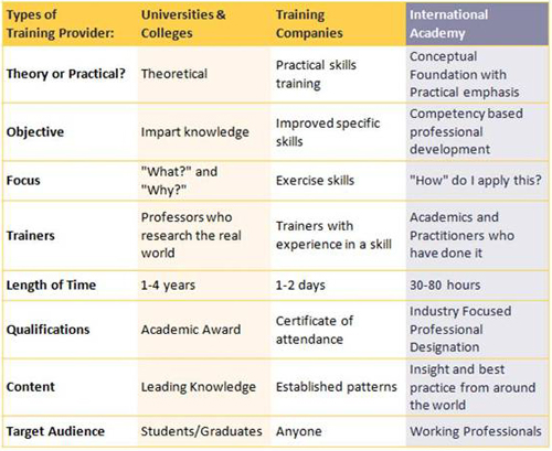 programs. We are less theoretical than universities and more relevant than basic training companies.