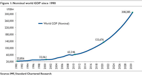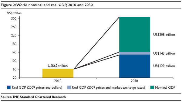 By 2030, the world economy could grow to US$308 trillion. Excluding Inflation that would equate to US$129 trillion in ral terms, or in today's prices, and to US$143 trillion, keeping prices constant, but allowing for some emerging market currency appreciation.